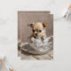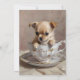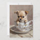 Avbildad i en oljemålad design är en Chihuahua-valp i en tekopp