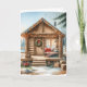 Personligens julkort. Cute lilla lilla festive-stugan med snöskogens bakgrund.