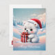 Liten julisbjörn är insvept i en mjuk, fluffig vit päls. Hans stora runda ögon lyser av nyfikenhet och glädje medan han håller sin present. Den lilla julisbjörnen utstrålar värme och trygghet och sprider en festlig stämning med sitt söta utseende och festliga tillbehör.