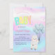 Små lammfår och ballonger på holografisk bakgrund. Dessa inbjudningar till babyduschen är enkelt anpassade för din händelse genom att du helt enkelt lägger till din händelseinformation.