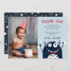 Söta platta tack-kort för din lilla monsters födelsedag har en söt leende monsterillustration med en elegant röd slips, på en ljus himmelblå bakgrund med marinblå bokstäver. Anpassa med ditt tackmeddelande och födelsedagsbarnets namn. Avsluta med att lägga till ett speciellt foto av födelsedagsbarnet till vänster. Designad för att samordna med våra födelseinvitationer och festtillbehör för Little Monster.