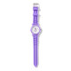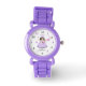 Söt liten prinsessa med mörkt hår och lila klänning på vit bakgrund