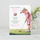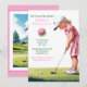 En charmig illustration av en ung flicka iklädd en rosa klänning och vit mössa, på en vacker golfbana under en klar blå himmel. Med berg i bakgrunden och en festlig atmosfär, fångar denna bild glädjen och koncentrationen hos ett barn som njuter av en unik golf-tematisk födelsedagsfirande. Perfekt för födelsedagsinbidningar, tematisk dekoration eller souvenirtryck för en sportig lilla enses speciella dag.