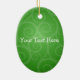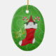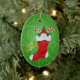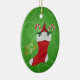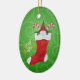 Det här keramiska ornamentet är mörkgrönt med ljusgröna virvlar med en liten tomte och godisstavar i toppen av en röd julstrumpa med grön julhagtorn och texten God Jul i guld. Anpassa din text på baksidan med mallen.