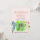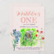Inbjudan med ett litet lamm och färgglada vilda blommor . En glad collage av akvarellmålningar för den lilla som firar sin första födelsedag.