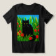 Tee i en liten svart katt med gult ögon, sitta i en trädgård, omgiven av röda tulpaner och grönt bladverk