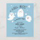Lilla Boo Budget Halloween Boy Shower-inbjudan designad med söt spöken och små hjärtan, blå bakgrund och svart typsnitt, för din lilla boo som nästan är värd!
