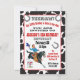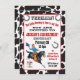 Så söt! Vintage lilla cowboyen rider sin svarta hingst och hoppar över ett stängsel med rum för att lägga hela sin ålder på en baksida av koskal. Hästskor, banderoller och roligt-typografi gör att det här poster stil westerna födelsedagsfest inbjudan-perfekt för din lilla buckaroo!
