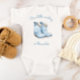 This cute baby bodysuit features a watercolor illustration of a pair of blue cowboy boots. Above, the phrase "Our little cowboy" or other text of your choice appears in blue handwriting script. Personalize with baby's name below. An ideal design fora boy's baby shower.