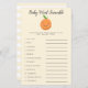 Ett kort för spädbarn med röntgenbilder i baby ord med orange som illustrerar en frukt med en könsneutral gult. Listan över ord på detta kort gäller spädbarn, och den är uppdelad. Gästerna kommer att tävla, som kan lösa upp alla först! SVAR NYCKEL: 1. bilsäte 2. mjölk 3. lekplats 4. nappar 5. blöjor 6. rockstol 7. dagis 8. baby monitor 9. svalg 10. formel 11. gummiducky 12. barnvagn.