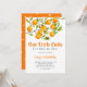 Kortet födelsedagsfest inbjudan, som ger en vattenfärgad illustration av citrusfrukt i orange på gren i träd. I texten står det: "Vår lilla kutym håller på att vända sig!" Jobbar för både pojkens och flickans födelsedagsfest på sommaren.