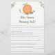 De här beundransvärda som känner till bästa kort för Mamma är en roligt babykläder. Ge dem bara runt under babyduschen där gästerna får roligt att besvara frågor om Mamma att vara! Personen med de rätta vinner! Utformningen gör att vattenfärgen blir grön med ett sött klementin.
