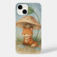 En vit vattenfärgsillustration av en liten räv som tar skydd under ett jättelikt svamprum under ett milt regn. Med mjuka, jordnära toner och en drömmande atmosfär fångar biet den tysta magin av en regnig dag i skogen.