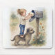 A little girl stands on a fluffy dog's back, reaching up to place an envelope in a mailbox nestled among wildflowers