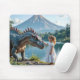 A young girl gently touches the face of a friendly dinosaur by a serene lakeside, with a majestic volcano in the background