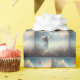 En ung flicka med långa flödande hår håller på en röd ballong i en misty fält fylld med färgstarka vilda blommor