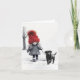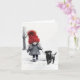 Den lilla flickan som bär en röd vinter går med sin svarta valp