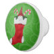 Den här keramiska lådsknappen är grönt med finare-snurrar och lite gnom i en röd julklapp med polkagrisar och löv och röda bär.