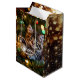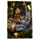 A sweet Christmas gift bag with a little kitten playing with a gold ornament on the Christmas tree.