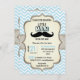 Kort för inbjudningar till en babydusch i pojke. Lil eller lilla man, mustasch tema. Blått, akvat och vitt chevron mönster med faux glitter. Hämta matchande klistermärken!