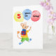 Ett födelsedagskort för en 4-åring med en handmålad kinkig mus, med en gåva och ballonger med ord "4 år gammal idag! Inuti texten står "Grattis på födelsedagen"