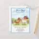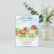 • An adorable watercolor design featuring two sweet little ponies standing in a grassy field in front of a rustic wooden fence and classic red barn. This delightful set is framed by a blue gingham border, perfect for a country farm-themed baby shower.