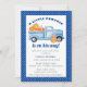 Ett blått pickupt lastbil transporterar en massa pumpor. Ett litet pumpa är på väg att omge det. Närmare information om babyduschen finns nedan i mjukt grått. En vit rektangel gör att texten och lastbil med pumpor verkligen utträder. Ett litet blått och vitt mönster ramar.