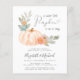 En söt och budgetvänlig par-babyduschinbjudan med "en söt liten pumpa är på väg", skriven i en blandning av mjuk grått-typografi och ett söt skript med en hjärtsvikt och en vattenfärgad bukett av en pastellpumpa, blommigtar och grön orange. Du kan ange genderna baby om du vill, t.ex. "är på väg".