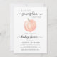 En söt babyduschinbjudan med gender-neutralt som innehåller "En söt liten Pumpkin är på väg", skriven i en blandning av grått-typografi och snyggt-skript med dekoration, och en pastellfärgad orange av en pumpa. Anpassa mor namn och duscha detaljer i enkel modern typografi. Ange baby gender om så önskas (t.ex. "är på väg").