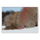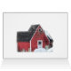 Ett litet hus i ett vinterlandskap med färgstark träd.