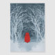 Lilla Red Riding-Huvan på en snövinter går genom skogen. Kan du se Vargen Big Bad som ligger i avstånd? En grungande version av en negativ vattenfärgsmålning.