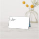 Placera Kort som visar lite haj. På baksidan av platskortet finns anpassade ord och en blå havskonstruktion. Det finns en mönster av hajsilhuetter på insidan av det uppfällda platskortet.
