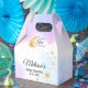 Present your party treats in these magical starry night favor boxes. The design highlights a golden crescent moon paired with a whimsical scattering of glitter stars over a blend of ethereal purple and blue watercolor hues. They make a charming addition to any gender-neutral "A Little Star is Brewing" themed event for expectant parents.