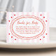 Encourage a meaningful keepsake gift with this sweetheart books for baby insert card, designed to coordinate with a Valentine-inspired baby shower theme. “Books for Baby” is displayed in elegant red script above a heartfelt message inviting guests to bring a book in place of a traditional card. The request is framed within a hand-drawn scalloped oval, set against soft pink and white stripes accented with scattered red hearts. Finished with a coordinating bow design on the back, this insert is a charming addition to sweetheart-themed or February baby showers, adding a thoughtful touch to the invitation suite.
