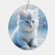 Personlig julprydnad. Vit kattunge med blå ögon som leker utanför en vinterdag i snö. Ai genererade konst.