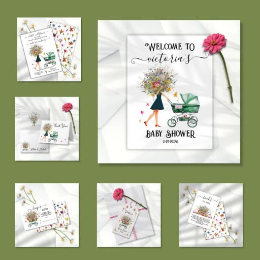 "Lite vildblomma" Babydusch. Underbar för en trädgård, utomhus eller för en boho. En stor bukett av vilda blommor i barnvagn. Könsneutralt med Blommor i muterad, ljusa pastel färg. Alla formuleringar kan ändras! Underbar för en trädgård, för jordbrukarnas marknad, för vilda blommor eller för picknick. Om du vill göra fler ändringar går du till Anpassa den här mallen. På grund kan du se "Vill du anpassa designen ännu mer? Klicka på EDIT med Design verktyg.