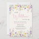 An elegant light cream baby girl shower invitation featuring "a little wildflower is on her way" showcased in a blend of modern light grey typography and a stylish pink script, and whimsical boho-inspired watercolors of dainty purple, pink and yellow wildflowers. Personalize the mother's name and shower details in simple grey and pink lettering.
