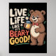 Denna beundransvärda illustration visar en glad brun björn, en röd sport som håller en burk av guldhonung. björnen har ett stort leende, lycklig, och utesluter positivitet. Texten "LIVE LIFE" (LIVE LIFE) visas ovanför björnen i vitt, med små blomaccenter, medan "LIKE IT'S" i vitt leder till den lekande "BEAR-Y BRA!" i en blandning av ljusblå och orange. Gröntens löv och subtila blommor bidrar till det naturliga och glatta temat och skapar denna utformning en ljuv påminnelse för att ta till sig livsstilets godhet.