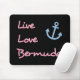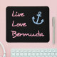 Visar frasen "Live Kärlek Bermuda" i ett skript eller handtryckt stil i rosa och ett blått båtankare. Svart bakgrund. Snygg design för Bermuda-invånare, turister, besökare, sjömän och båtar. Snygg lugn, lycklig-design för att påminna dig om vad livet handlar om. Fira Bermuda-öarnas glädje och frihet.