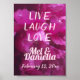 Live Laugh Kärlek! Det här är er bröllop poster att välkomna era gäster. Använda så många som du behöver för att markera riktningar till bröllop-platsen eller -rummen. Blommigtar i bedövande lila peonies, med blek rosa i ord. Det är enkelt att anpassa namn, datum och det speciella meddelandet. Fläckfotografi visar uppgifter om blommor. Gör varje ögonblick av din bröllopsdag lika underbar som du!