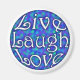 En originaldesign på en magnet med ord: live, skrattar, kärlek på en blå blommigt i bakgrunden. Ursprunglig design efter klshaw