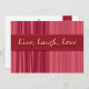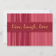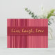 Lev, Laugh och Kärlek på Mor's Day brunch eller party med trendigets inbjudan till Rosa strimlade Mor. Lodrät linjer i skuggor av rosa, lila och röd criss-kor i stil, med en banderoll som proklamerar"Live, Laugh, Kärlek" i gult. På baksidan står"Lycklig Mor dag", och du kan anpassa ytterligare text för ett verkligt personligt meddelande. Glöm inte matchande brevlådor och kuvertdekaler!