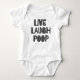Den här karosseritexten i baby har en enkel teckensnittstext som skrivs ut på framsidan och som lyder "Live Laugh Poop". Texten kommer sannolikt att vara i svart eller ett kontrasterande färg som står emot den vita eller ljusa färgaden av karosseri. Teckensnittet är förmodligen lätt att läsa och enkelt, utan några mer avancerade blommor eller dekorationer. Uttrycket "Live Laugh Poop" är ett lekfullt och humoristiskt uttryck som ofta förknippas med spädbarn och deras omsorgsfulla, glatta natur.