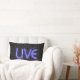 Upplyst tegelvägg i tätbebyggelse med LIVE-text i ljusnande lila neon ljus.