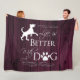 Håll dig mysigt på kyliga fallkvällar med ett Life är bättre med en Hund Fleece Blanket. Blankettexten "Livet är bättre med en Hund." med ett packtryck och hund silhouette-utsmyckning mot en djup magenta, rustik träbakgrund. Ytterligare presentartiklar tillgängliga med den här designen också.