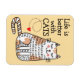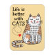 Sött roligt klotter av en katt som sitter upp med slutna ögon, rosa kinder och tanfläckar. Till vänster om henne står orden livet är bättre med katter i en rolig svart teckensnitt. Ett litet rött kärlekshjärta svävar nedåt från bokstaven C och bakgrunden är beige.