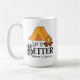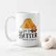 Citat om camping. Livet är bättre runt en lägereld. Sött Kawaii-inspirerat seriekonst med ett tält och eld.