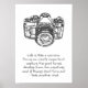 En svart-vit affisch med en bild av en kamera med ett upplysande och motiverande citat om livet och hur vi bör ställa in vårt perspektiv. "Livet är som en kamera. Fokusera på det som är viktigt, fånga de goda tiderna, utveckla från det negativa och om saker inte blir som man vill - ta ett nytt foto." Citatets författare är okänd. Designen och citatet är bra för fotografer eller någon som behöver en uppryckning i livet.
