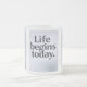 Påbörja er dag med detta "Livet börjar i dag" mugg! Med fet, lekfull text är det perfekt för kaffe eller te, som inspirerar till en ny början. En snyggt som motiverar gåva att gripa dagen!
