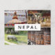 Vykort med fyra bilder av Nepals liv och landskap, som tempel och bön hjul i Katmandu, trösksäd i Bhaktapur och elefant safari i Chitwan NP.